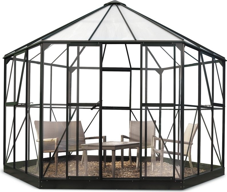 De långa panelerna av härdat glas på sidorna skapar ett vackert och elegant växthus där du har fullt synfält över hela trädgården oavsett vinkel inne i växthuset.