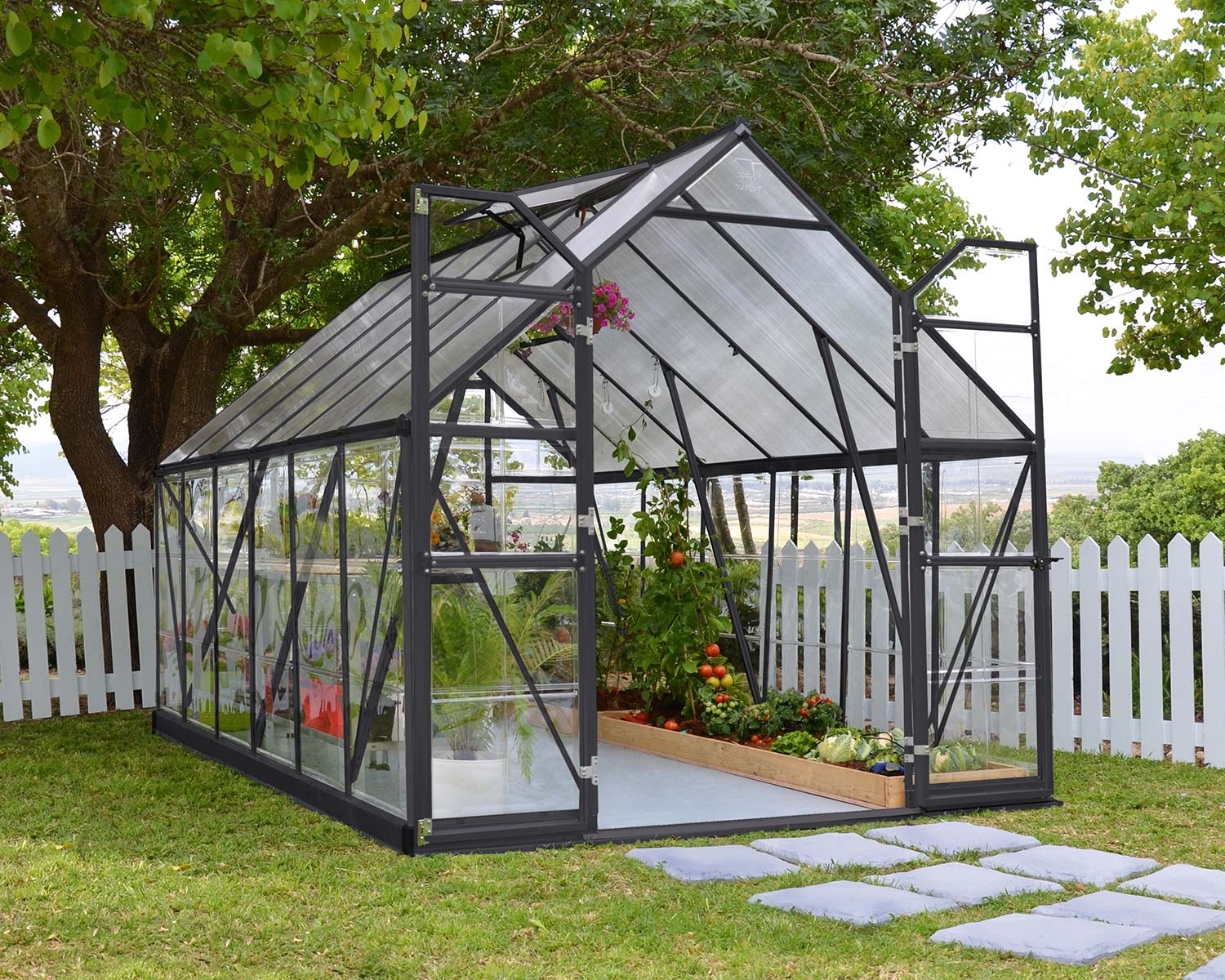 De integrerade takrännorna leder regnvattnet till hörnen där du kan leda vattnet till en regnvattentunna (ingår ej) – en miljövänlig lösning som är både miljövänlig och sparsam. Dessutom har växthuset två öppningsbara takfönster för effektiv ventilation under varma dagar.