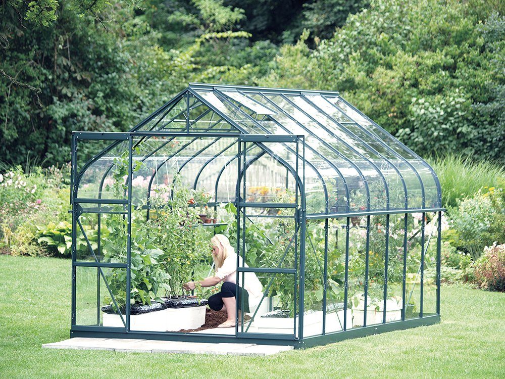 Växthuset har en dubbel skjutdörr för att enkelt få in en skottkärra när det är planteringsdags.