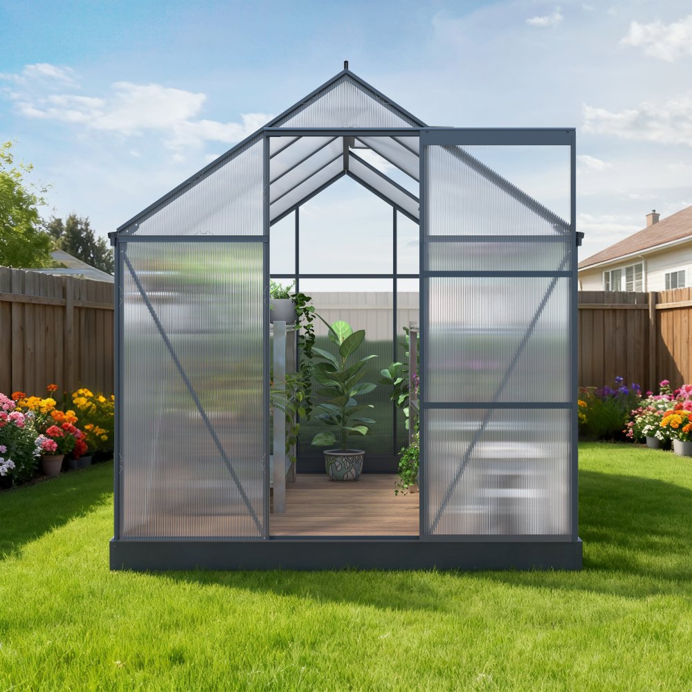 De 4 mm tjocka, dubbelväggiga polykarbonatskivorna skyddar växterna mot väder och vind, samtidigt som de ger ett behagligt ljusinsläpp för optimal tillväxt. Den galvaniserade stålsockeln säkerställer stabilitet, och den justerbara takluckan gör det enkelt att reglera ventilationen under varma dagar.