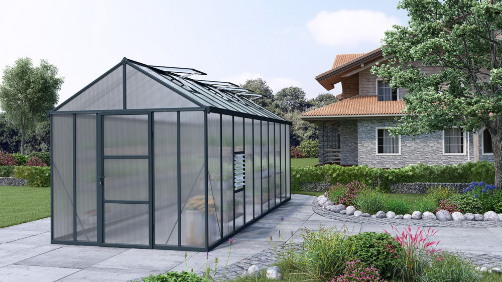 Ett innovativt växthus med (el-fri) automatisk ventilation. Rutorna/ panelerna är tillverkade av mycket slagtålig 2-väggig polykarbonat som också har utmärkta isolerande egenskaper, samtidigt som det skärmar av skadlig uv-strålning.