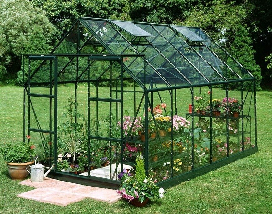 Växthuset finns i de valbara alternativen aluminiumprofiler och kanalplast, gröna profiler (RAL6009) och 3 mm glas samt gröna profiler och 3 mm härdat glas.