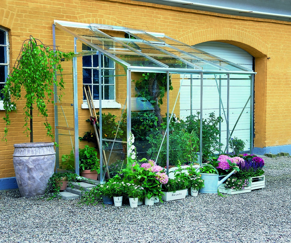 Royal 4,8 m² är ett väggväxthus som med enkelhet också kan inredas som ett litet kombinerat växthus och uterum. Den här typen av växthus mot vägg tar även väl vara på spillvärme inifrån huset, som väl kan bidra till att behålla ljum värme över natten samt förlänga odlingssäsongen.