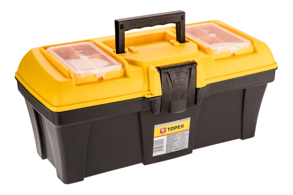 Upptäck den perfekta följeslagaren för alla dina DIY-projekt med vår praktiska verktygslåda från Topex. Denna kompakta verktygslåda erbjuder smart förvaring med sina två små förvaringsutrymmen i locket, där du enkelt kan organisera och hålla reda på småföremål som skruvar, muttrar och andra tillbehör. Tillverkad av hållbar plast är verktygslådan lätt att bära och resistent mot slitage, vilket gör den idealisk för både hemmabruk och arbete.
