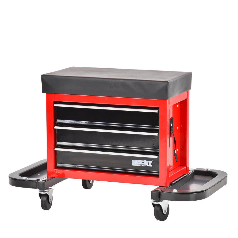 Verktygslåda med hjul och tre utdragbara lådor. Magnetiska vikbara sidor för förvaring av skruvar, muttrar och diverse metallbitar som arbetas med. Verktygshållare.