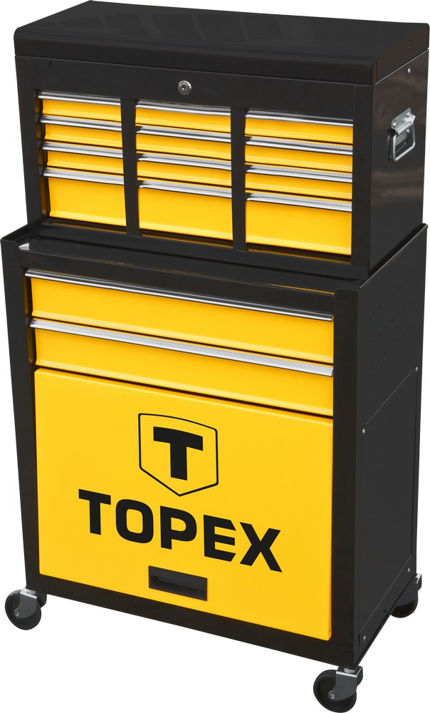Ett verktygsskåp på hjul bestående av 2 moduler. Den nedre modulen har 1 stort fack med 2 lådor ovanpå, den övre modulen har mindre lådor, nyckellås och två handtag på sidorna då man kan bära med sig den.