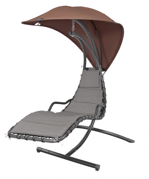 Mjukt gungande vilohängstol med solskydd. Passar fintfint på altanen i sommarvärmen. Bör inte utsättas för regn eller nattfukt.
