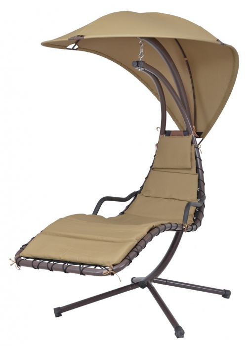 Mjukt gungande vilohängstol med solskydd. Passar fintfint på altanen i sommarvärmen. Bör inte utsättas för regn eller nattfukt.
