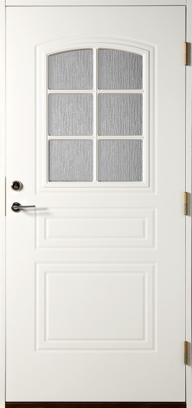 En oslagbar klassiker. Dörr med stor bågad glasöppning för ljusinsläpp. Cotswoldglas för insynsskydd. Säkerhetslåskista för mellanvred och hemma/borta funktion.