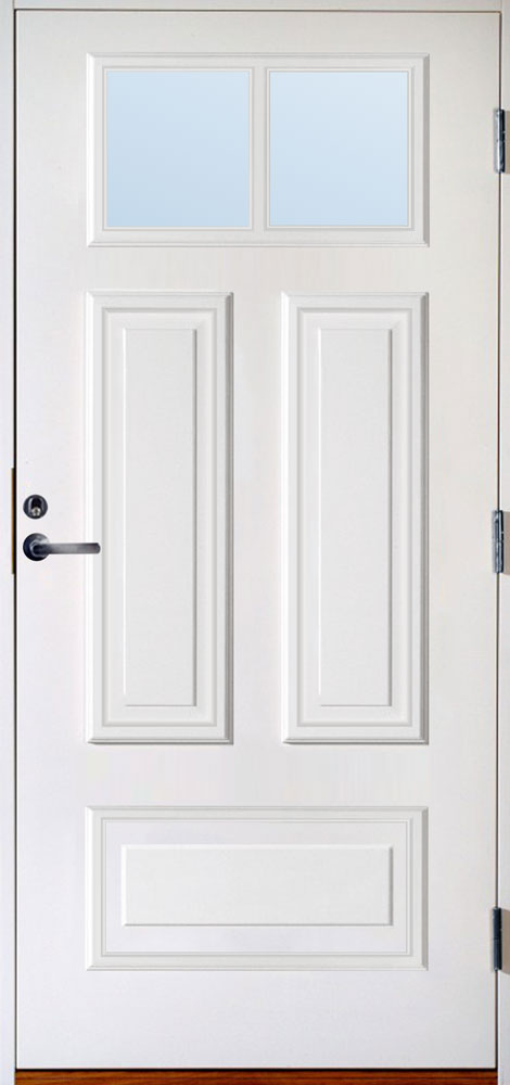 Det rektangulära fönstret är en välisolerande 3-glaskassett (4/14/4/14/4 mm) med argon mellan glasen, och finns i flera utföranden, klarglas, cotswoldglas och frostat glas. Val av glas bottnar i om du vill eller inte vill kunna se in/ut, och påverkar även utseendet på dörren något.