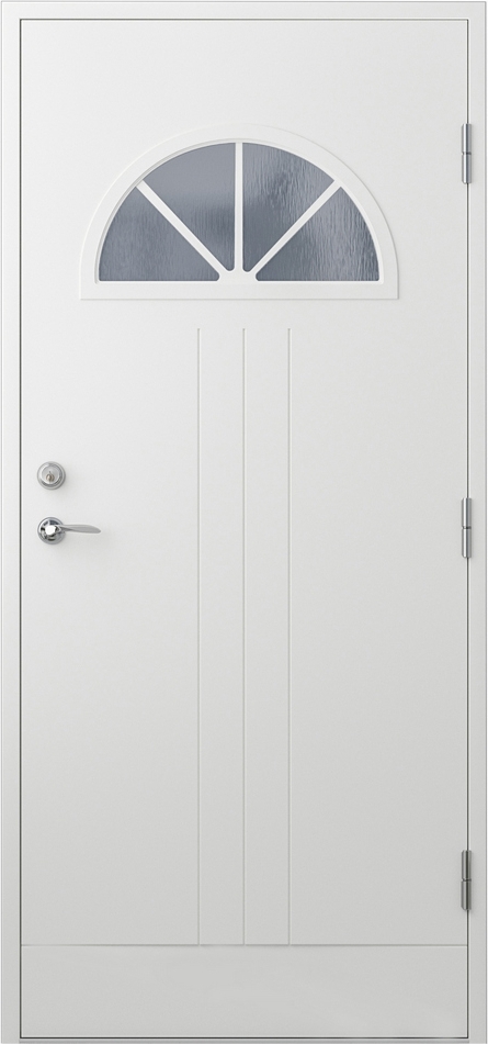 Ytterdörr Carina med glas och spröjs har ett charmigt halvmånefönster med fasta spröjs som ger dig ett trivsamt ljusinsläpp i din entré. Dörren är dekorerad med spårfrästa linjer och listverk som ramar in fönstret. Här kan du välja om du vill ha insynsskydd med cotswoldglas eller frostat glas. Föredrar du att kunna se vem som kommer finns alternativet klarglas. Du kan också kombinera cotswoldglas eller frostat glas med ett titthål. Denna härliga dörr passar fint till den klassiska, såsom den traditionella eller moderna arkitekturen.