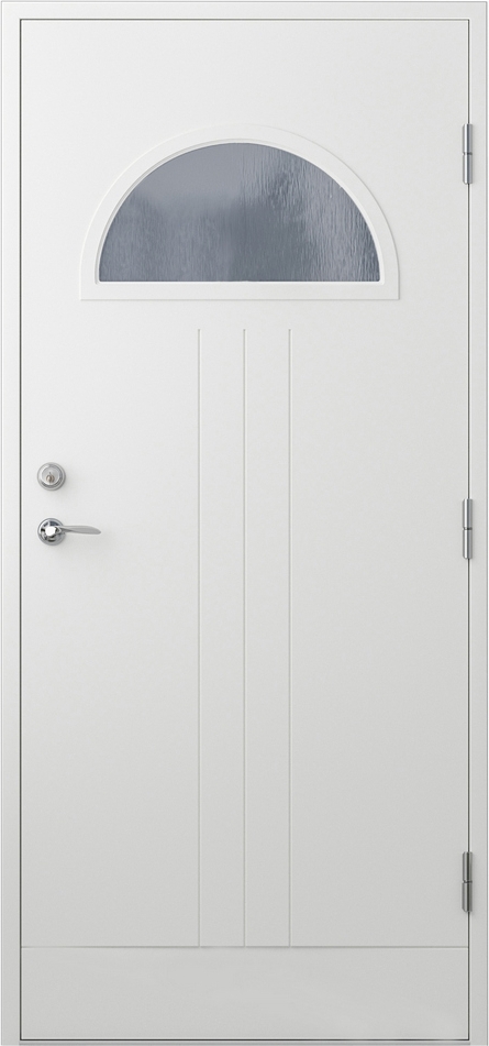 Ytterdörr Carina med glas (utan spröjs) har ett charmigt halvmånefönster som ger dig ett trivsamt ljusinsläpp i din entré. Dörren är dekorerad med spårfrästa linjer och listverk som ramar in fönstret. Här kan du välja om du vill ha insynsskydd med cotswoldglas eller frostat glas. Föredrar du att kunna se vem som kommer finns alternativet klarglas, eller kan du kombinera ett insynsskyddat glas med ett titthål. Denna härliga dörr passar fint till den klassiska, såsom den traditionella eller moderna arkitekturen.