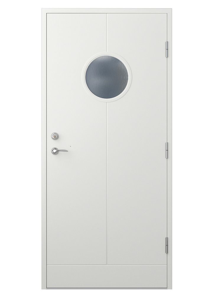 Ytterdörr Jennifer med glas har ett härligt runt fönster som för tankarna till båtens kabyss. Med sin kontrasterande formgivning “kantigt möter runt” blir designen tilltalande och spännande trots sin enkelhet. Det lilla fönstret ger en behaglig insyn och ett fint ljusinsläpp. Föredrar du att ha insynsskyddat kan du välja mellan frostat glas och cotswoldglas.