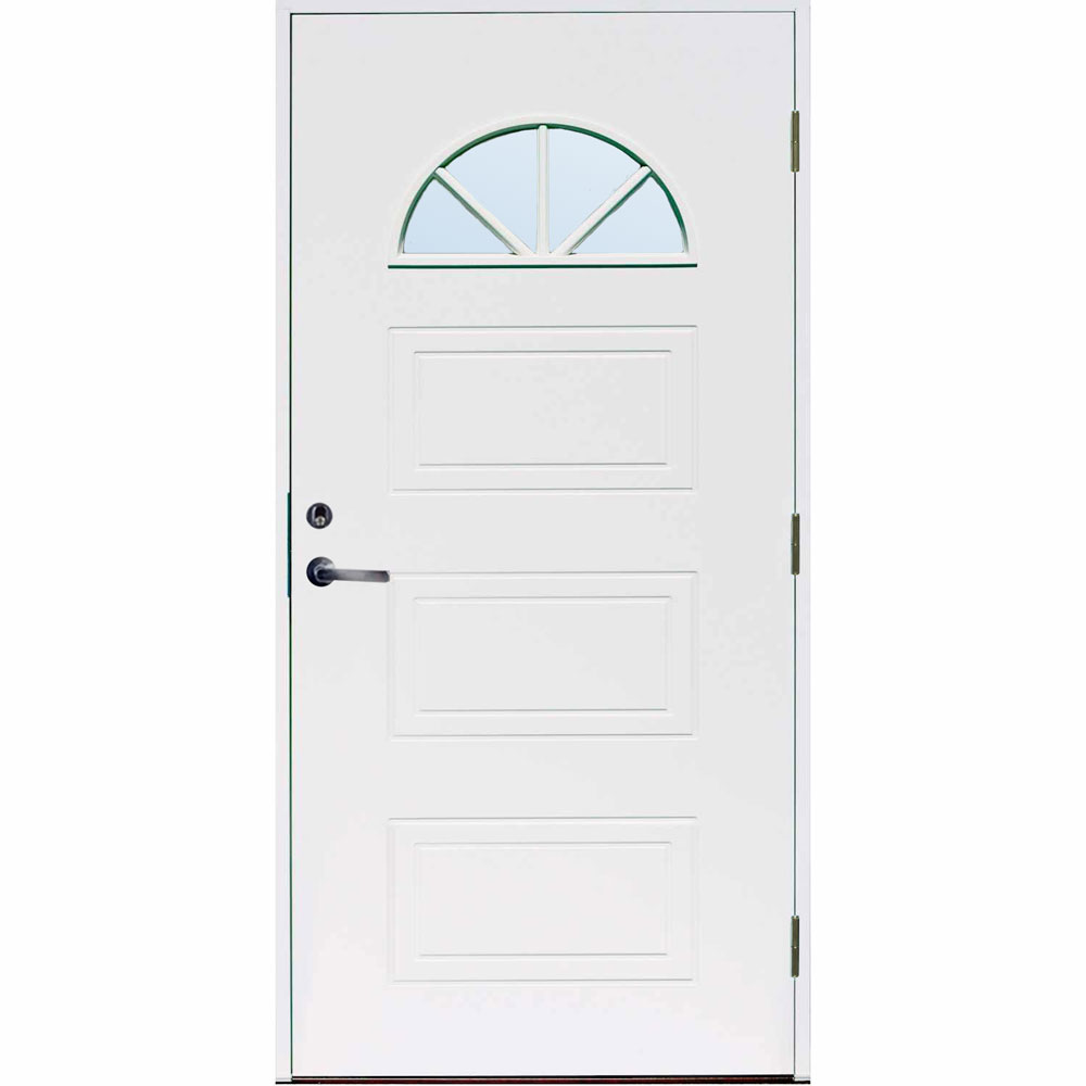 Det fina halvmåne-fönstret i dörren är i välisolerande 2-glaskassett med argonfyllning mellan glasrutorna.