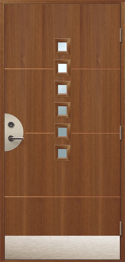 Ytterdörr Ruth Teak har med sina sex små fönster ett härligt ljusinsläpp, men ändå knappt någon insyn. Dörren är något utöver det vanliga med sin naturliga teak faner, i kombination med spårfrästa linjer och matta rostfria skyddsplåt både vid handtaget och dörrens nederkant. Denna karaktärsstarka dörr för tankarna till 50-talet samtidigt som den moderna arkitekturen kan passa in med dess trevliga formspråk.