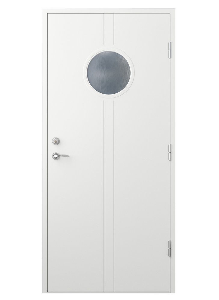 Ytterdörr Oknö har med sitt runda fönster en lite annorlunda och tilltalande touch. Det spårfrästa mönstret dekorerar dörren och ramar in fönstret i all sin enkelhet. Fönstret ger ett mindre ljusinsläpp och kan beställas med klarglas, cotswoldglas eller frostat glas beroende på om du vill ha insynsskydd.