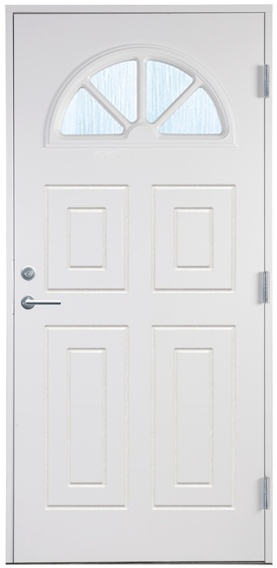 Ytterdörr Vadstena med glas har ett härligt halvmånefönster med spröjs som går att få i olika glasutföranden, och som oavsett ditt val av glas bidrar med ett fint ljusinsläpp i din hall. Det spårfrästa mönstret bildar fyra speglar i två storlekar som en fin dekoration med tredimensionell känsla. Dörren passar bra till stugan såsom den traditionella eller den klassiska arkitekturen.